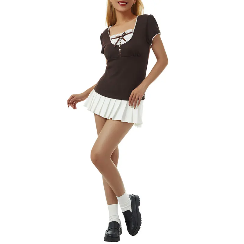 Harajuku Grunge T-shirt Women Korean Preppy Style Kawaii Bow Crop Top Vintage Patchwork Square Collare Puff Sleeve Milkmaid Top
