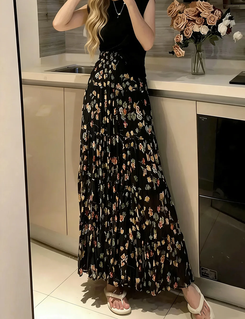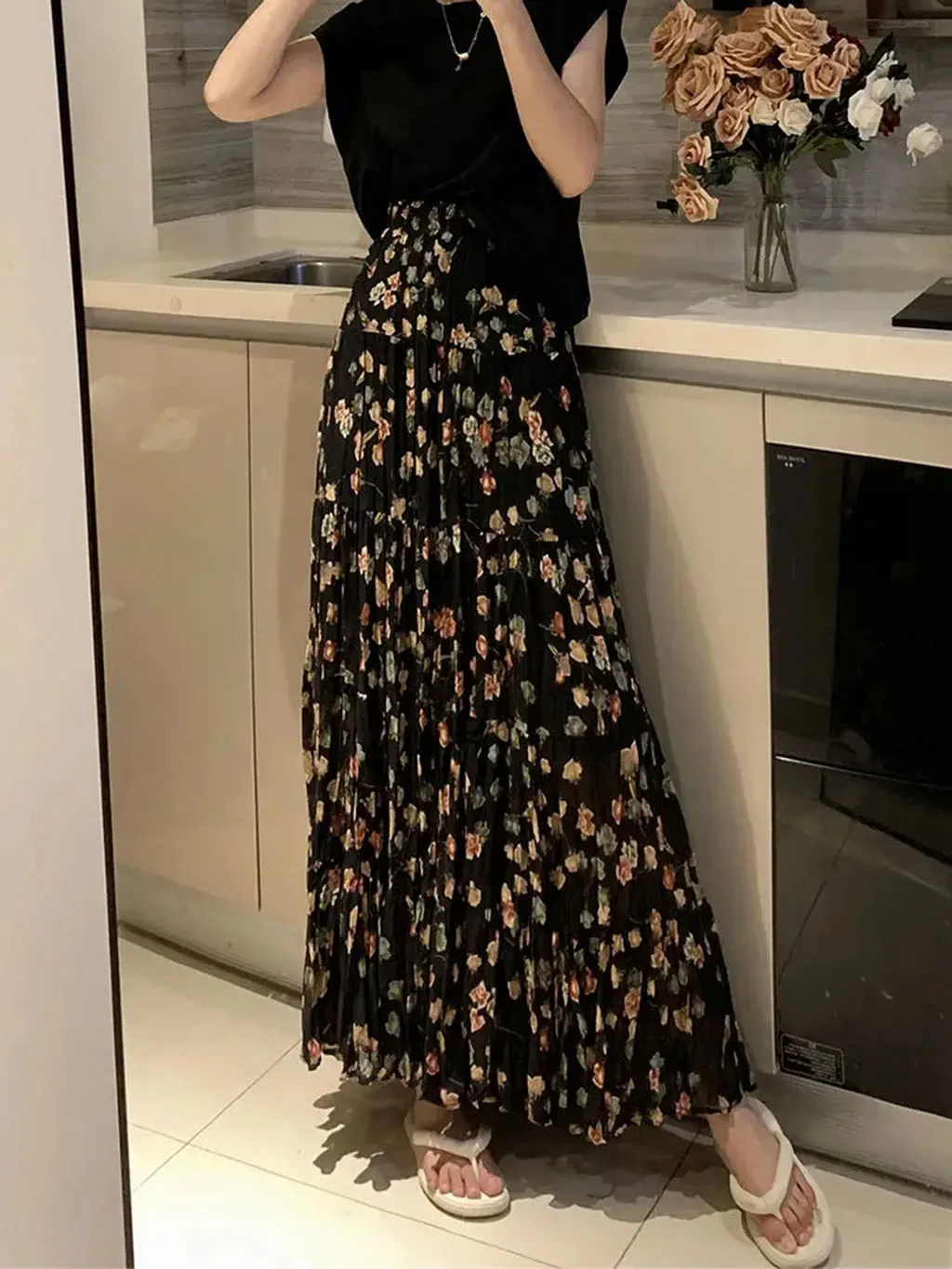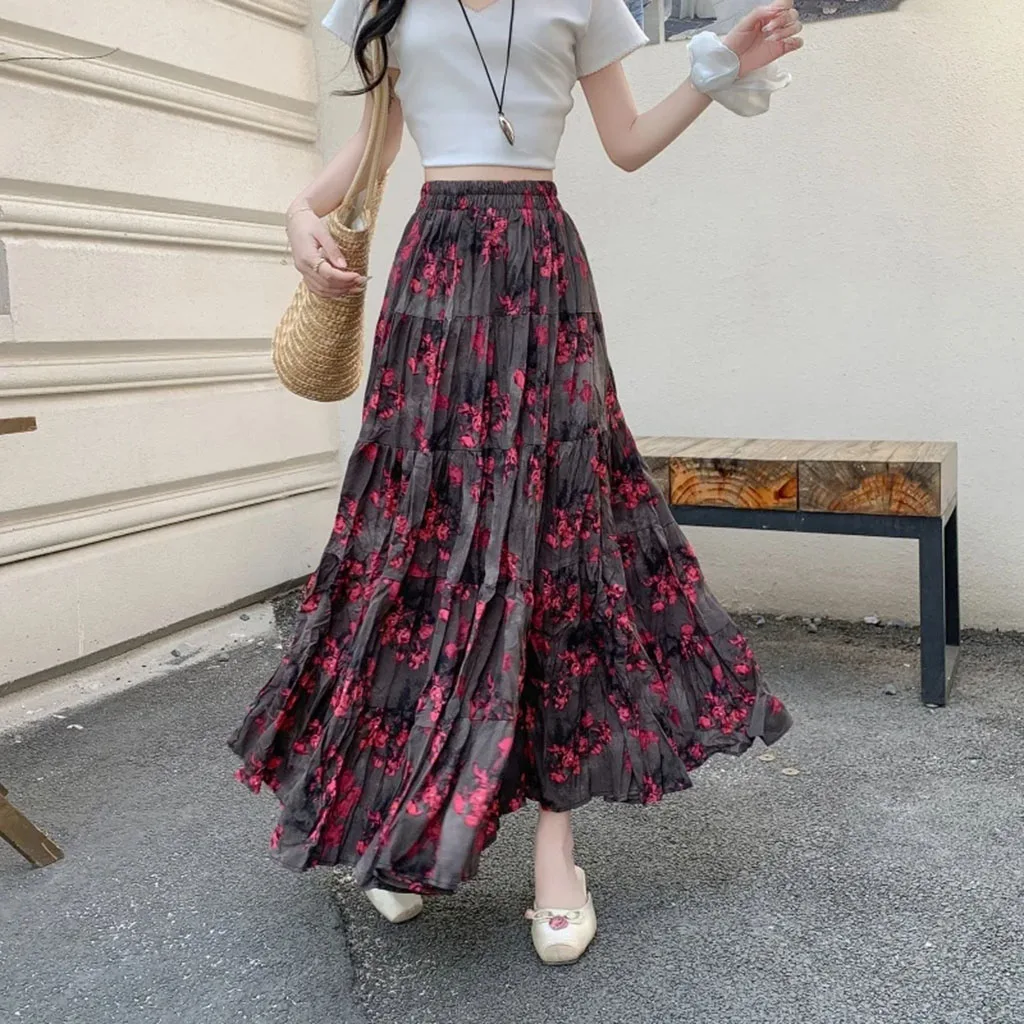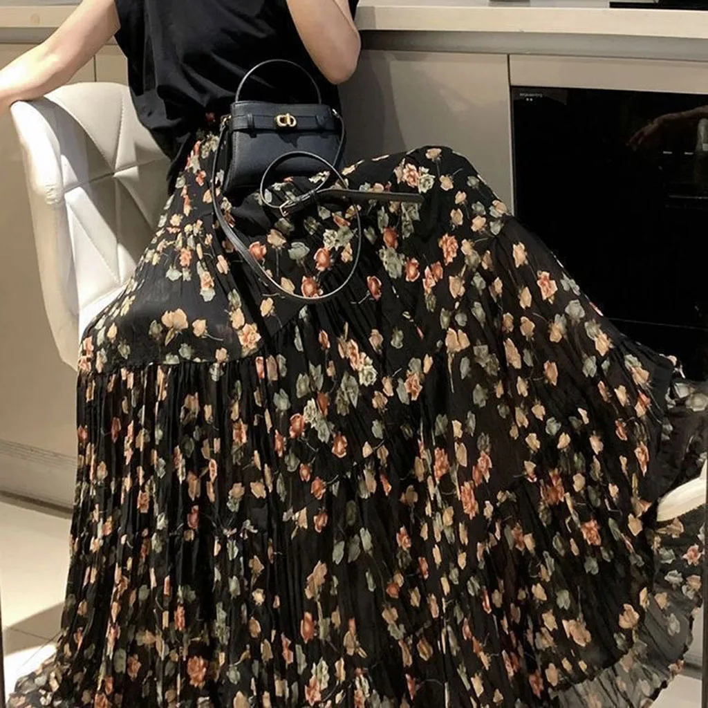 New Fashion Summer Trendy Women's Elegant Ink Dyed Printed A-line Skirt Women's Elastic High Waist Splicing Folded Long Skirt