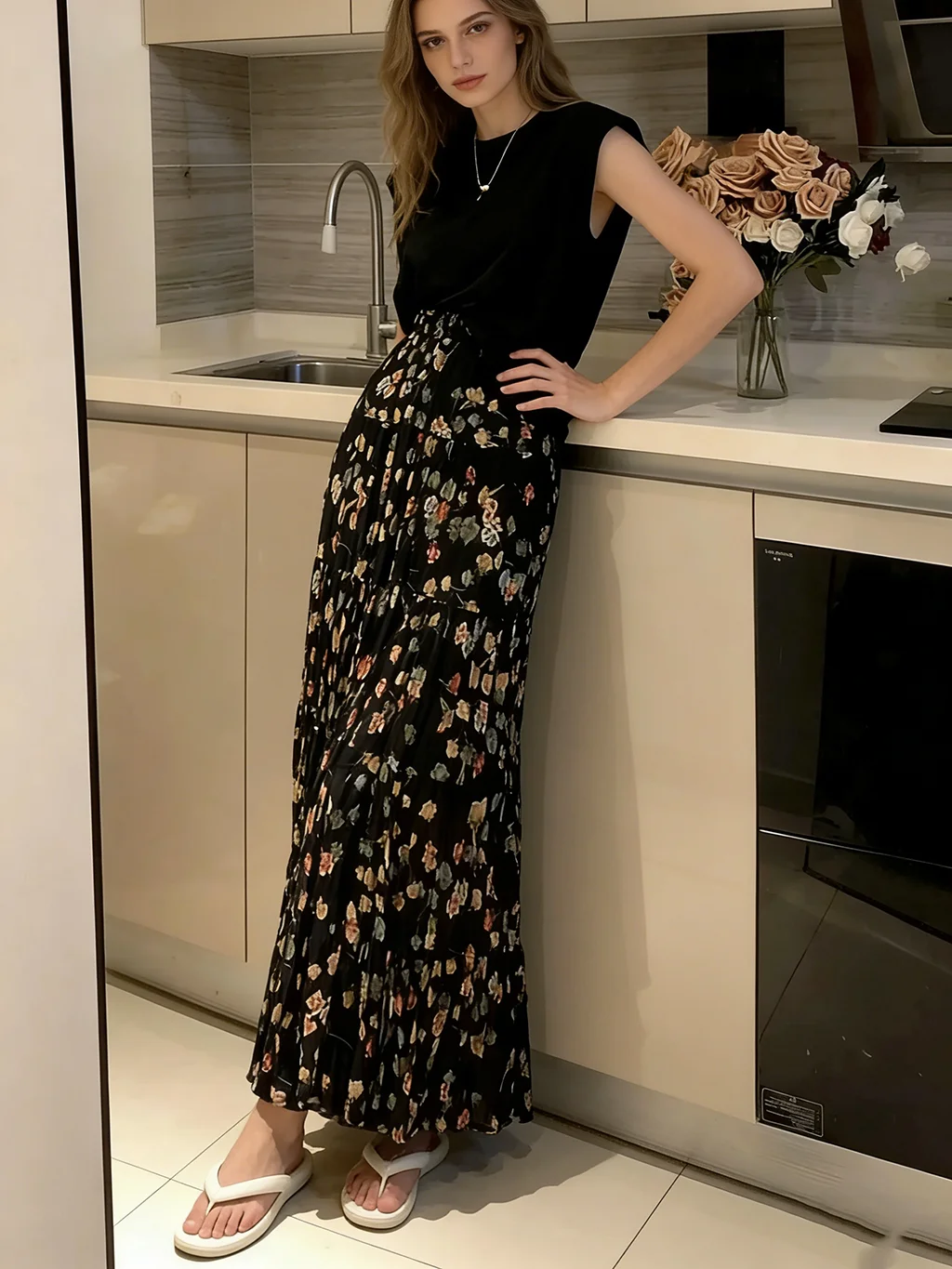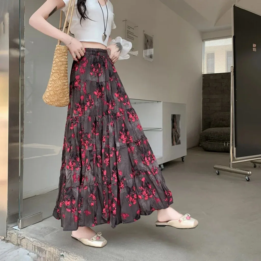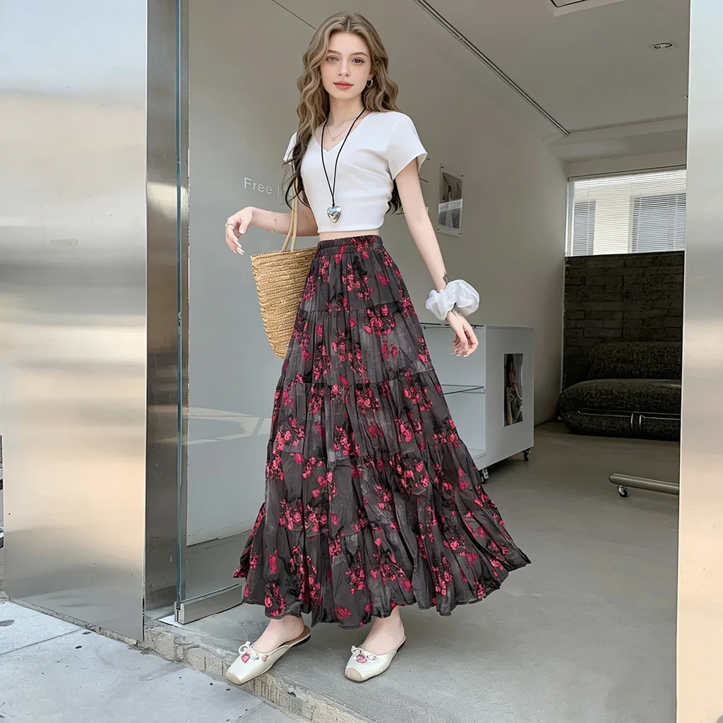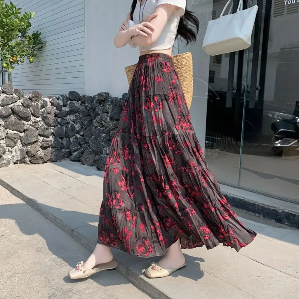 New Fashion Summer Trendy Women's Elegant Ink Dyed Printed A-line Skirt Women's Elastic High Waist Splicing Folded Long Skirt