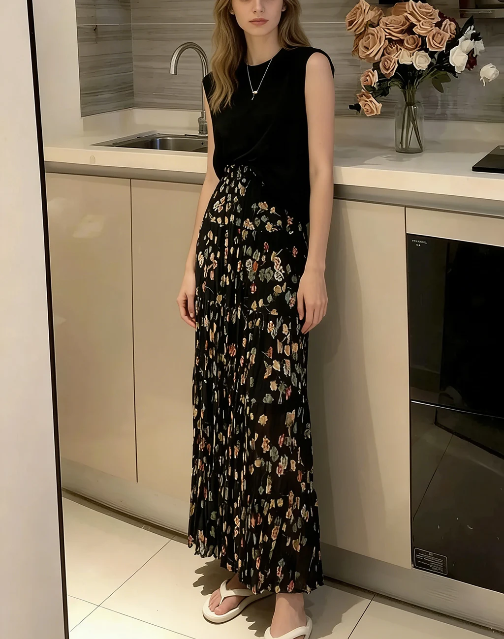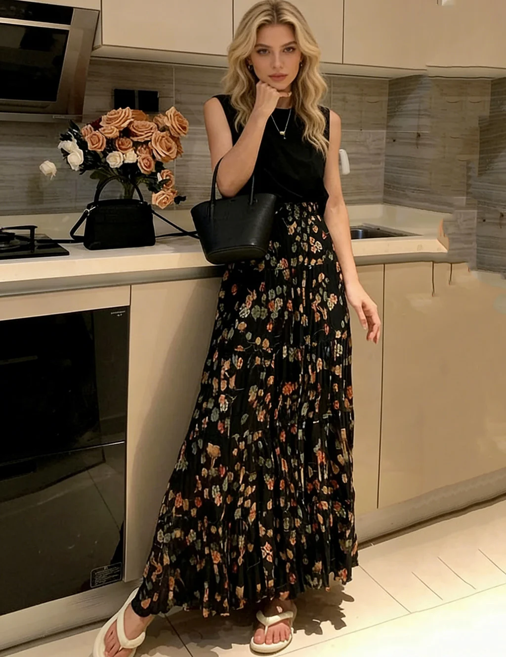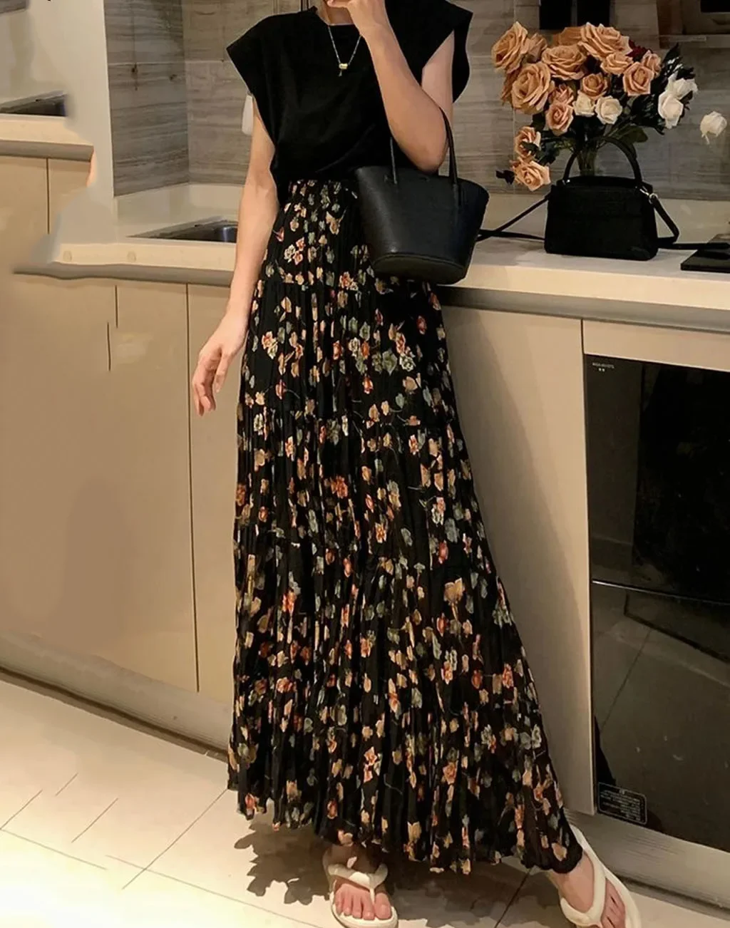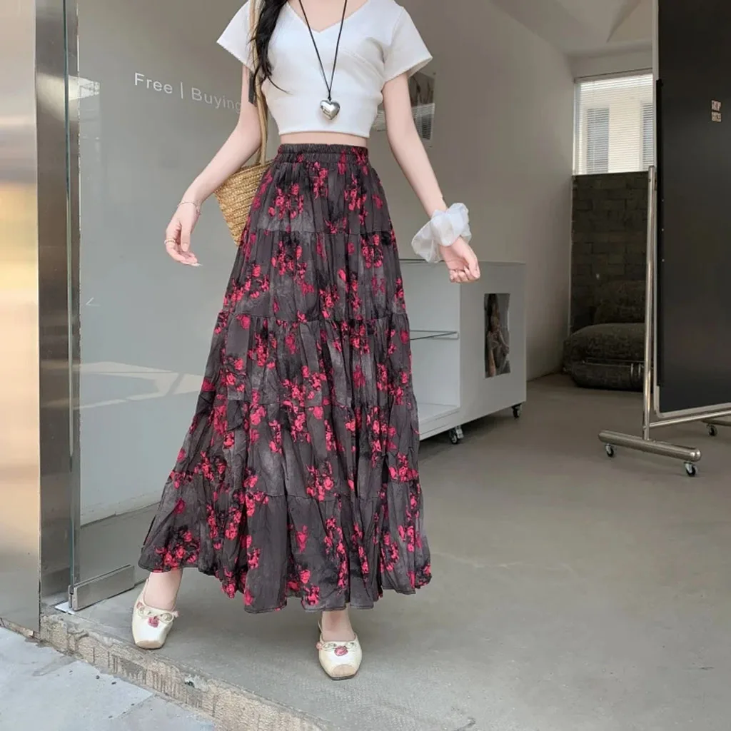 New Fashion Summer Trendy Women's Elegant Ink Dyed Printed A-line Skirt Women's Elastic High Waist Splicing Folded Long Skirt